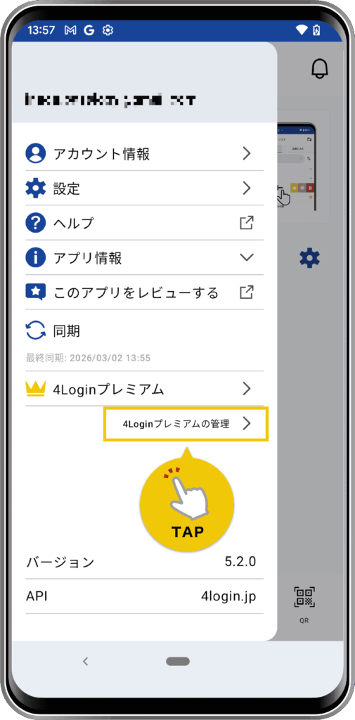 メインメニューから「4Loginプレミアムの管理」をタップします。