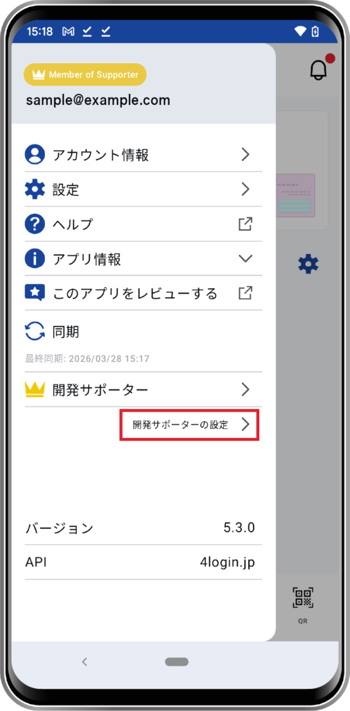 メインメニューの「開発サポーターの設定」をタップします。