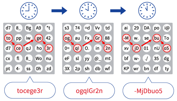 利用者は自分のパターンに沿ってマトリックス表を読み取り、その時点で有効な文字列(ダイナミックパスワード)を取得します。これは知識認証に分類され、本人しか知らないパターンが認証の鍵となります。