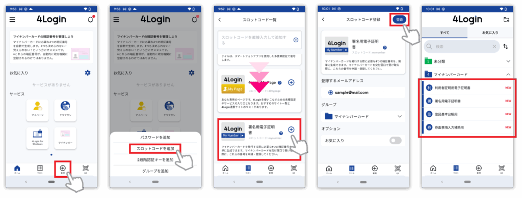 4Loginアプリでは、マイナンバー専用の暗証番号を自動生成でき、1つのパターンで申請に必要な4種類の暗証番号に対応しています。※作成した暗証番号は自動的に政府機関へ登録されることはありません。