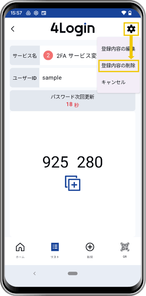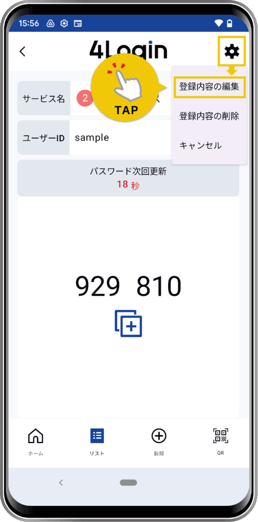 パスワード画面の左上、歯車マークから「登録内容の編集」をタップします。