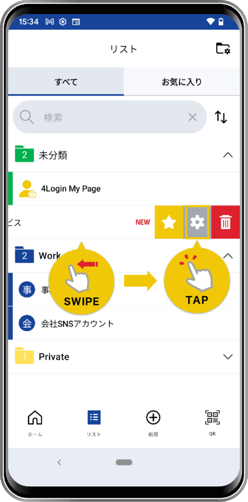 リスト画面から該当のパスワードを左にスワイプし、歯車マークをタップでもOKです。