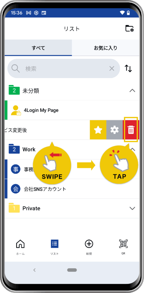 リスト画面から該当のパスワードを左にスワイプし、ゴミ箱マークをタップでもOKです。