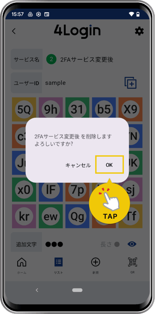 パスワード画面の左上、ゴミ箱マークから「登録内容の削除」をタップします。