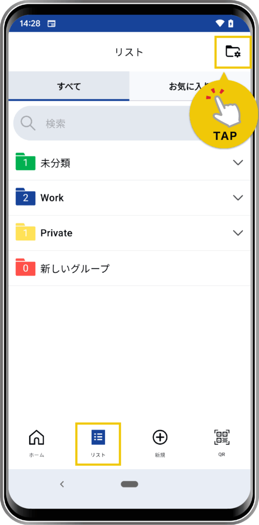 画面下メニュー「リスト」からパスワード一覧画面に移動して、