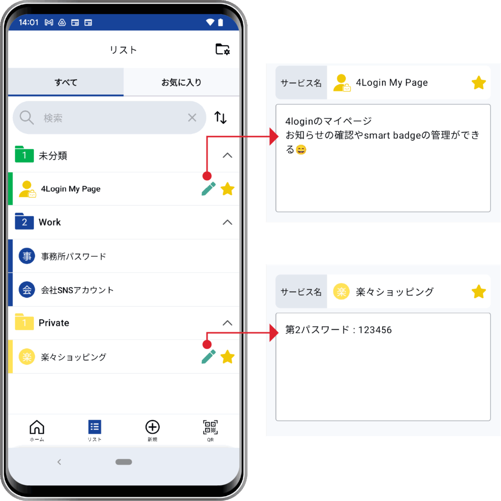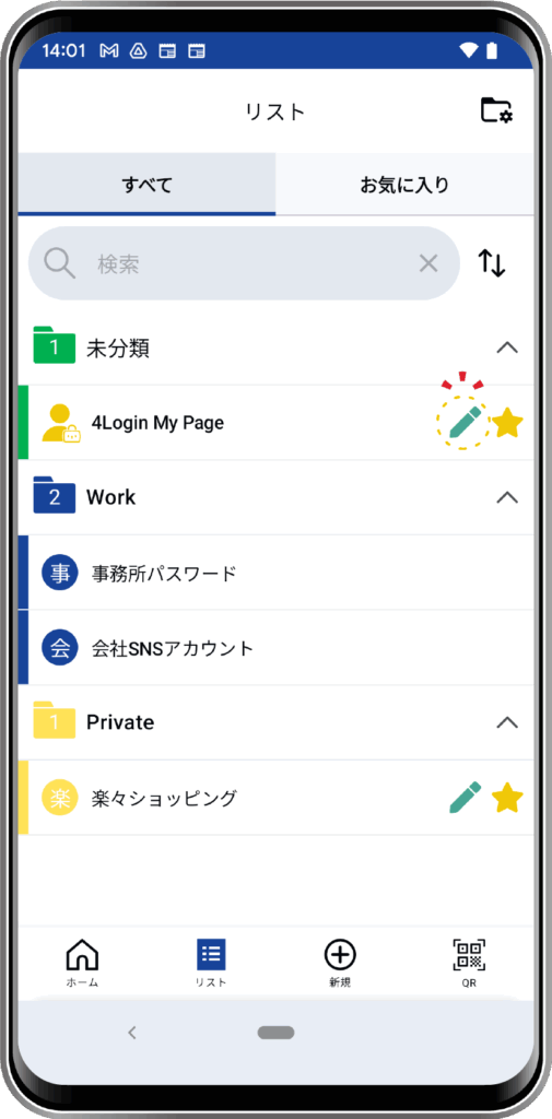 下メニューの「リスト」からメモを追加したいパスワード(またはスロット)をタップします。