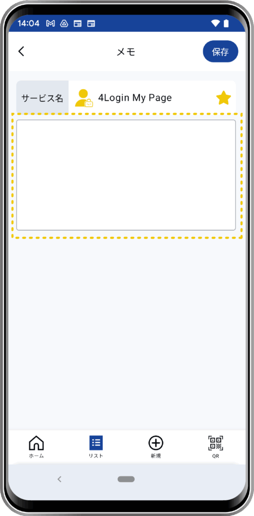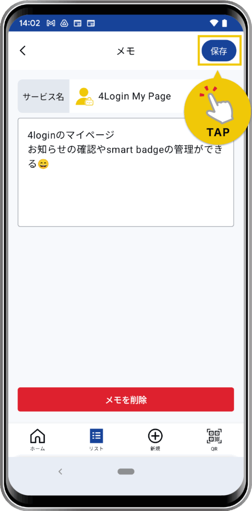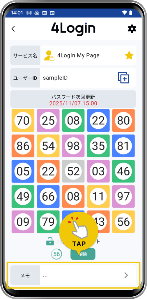 パスワード(またはスロット)画面のメモをタップし、パターンを入力すると「メモ」を記入することができます。