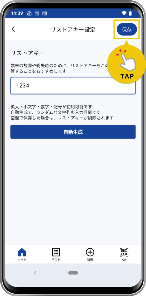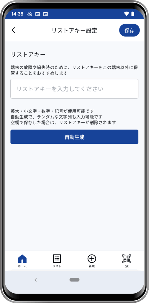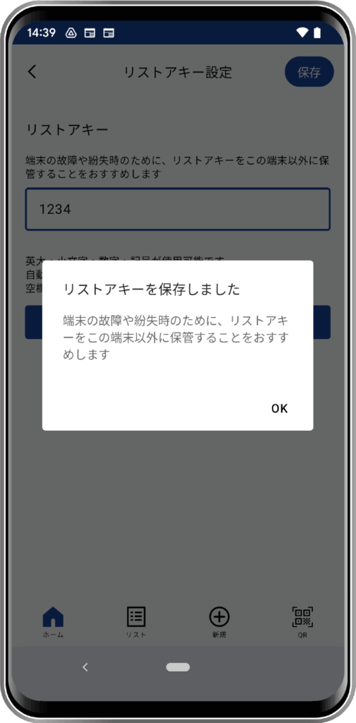 また、リストアキーをひかえておく場合は、端末をなくしてしまった時に備えて、その端末以外の場所や、ほかの端末からも参照が可能な場所に保管しておくことをおすすめします。