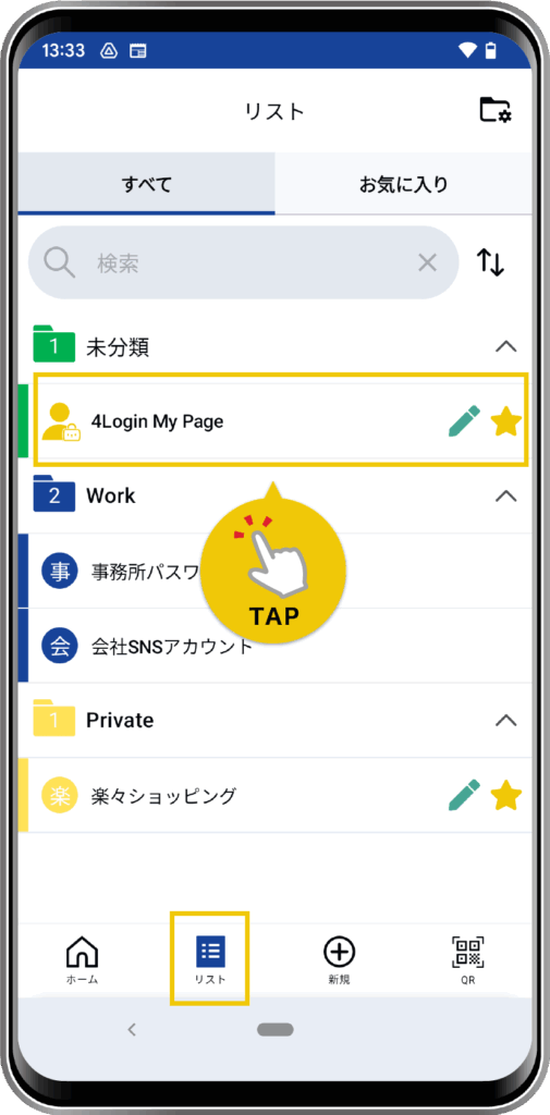 または、下メニュー「リスト」でリスト一覧にある「4Login My Page」をタップします。