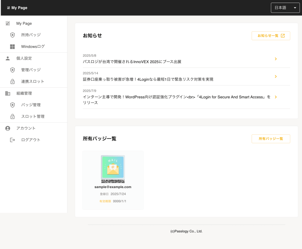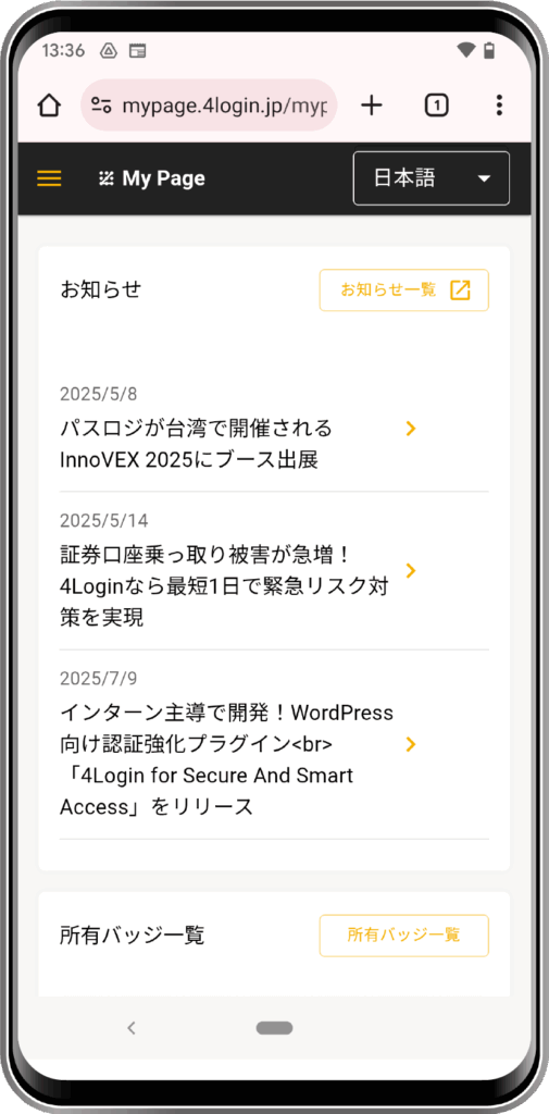マイページはスマホ・PCどちらでも閲覧可能なWEBサービスです。お知らせの閲覧や取得したSmart Badgeを確認することができます。