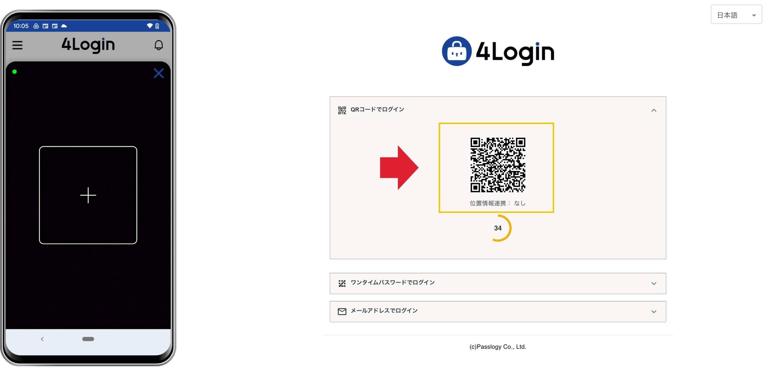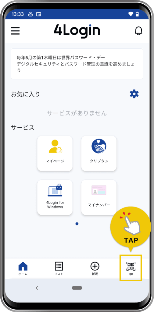 4Loginアプリを開き、下メニューの「QR」をタップします。