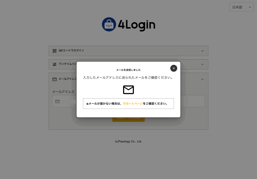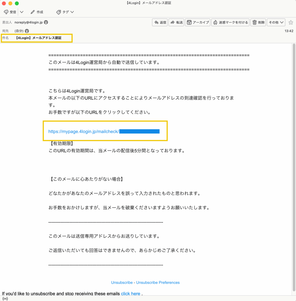 入力したメールアドレスに4Loginから確認用メールが届きます。