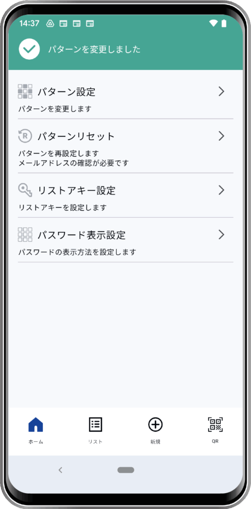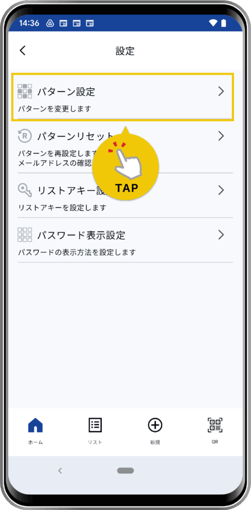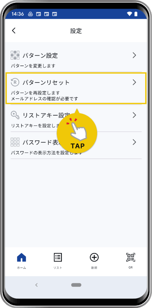 画面左上メニューボタンから「設定」→「パターンリセット」をタップします。