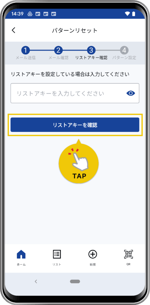 4Loginアプリに戻り、設定していたリストアキーを入力して、「リストアキーを確認」をタップします。