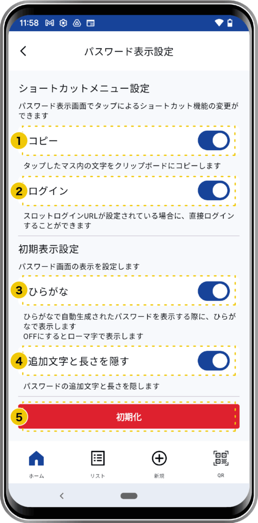 パスワード(またはスロット)画面は自分の使いやすいように設定を変更することが可能です。