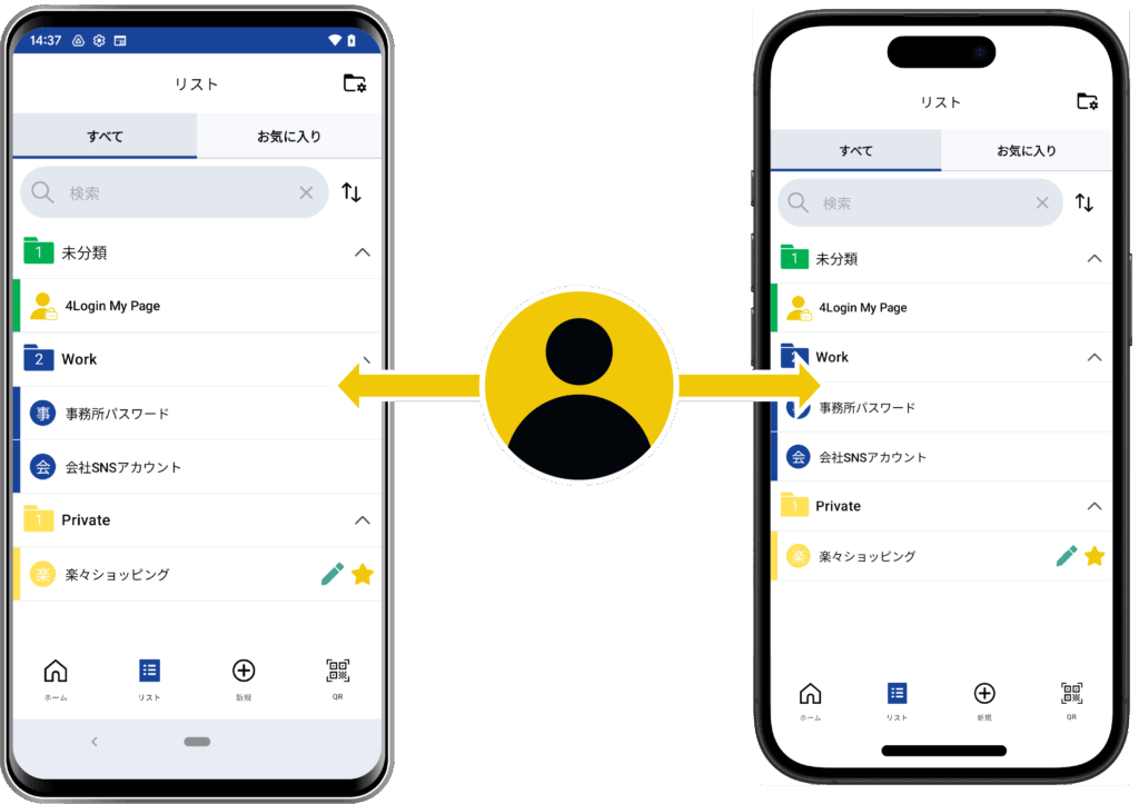 4Loginアプリでは、スマートフォンとタブレットなど、複数端末で4Lognアプリのアカウントを共有し、それぞれの端末で同じパスワードデータを参照することができます。